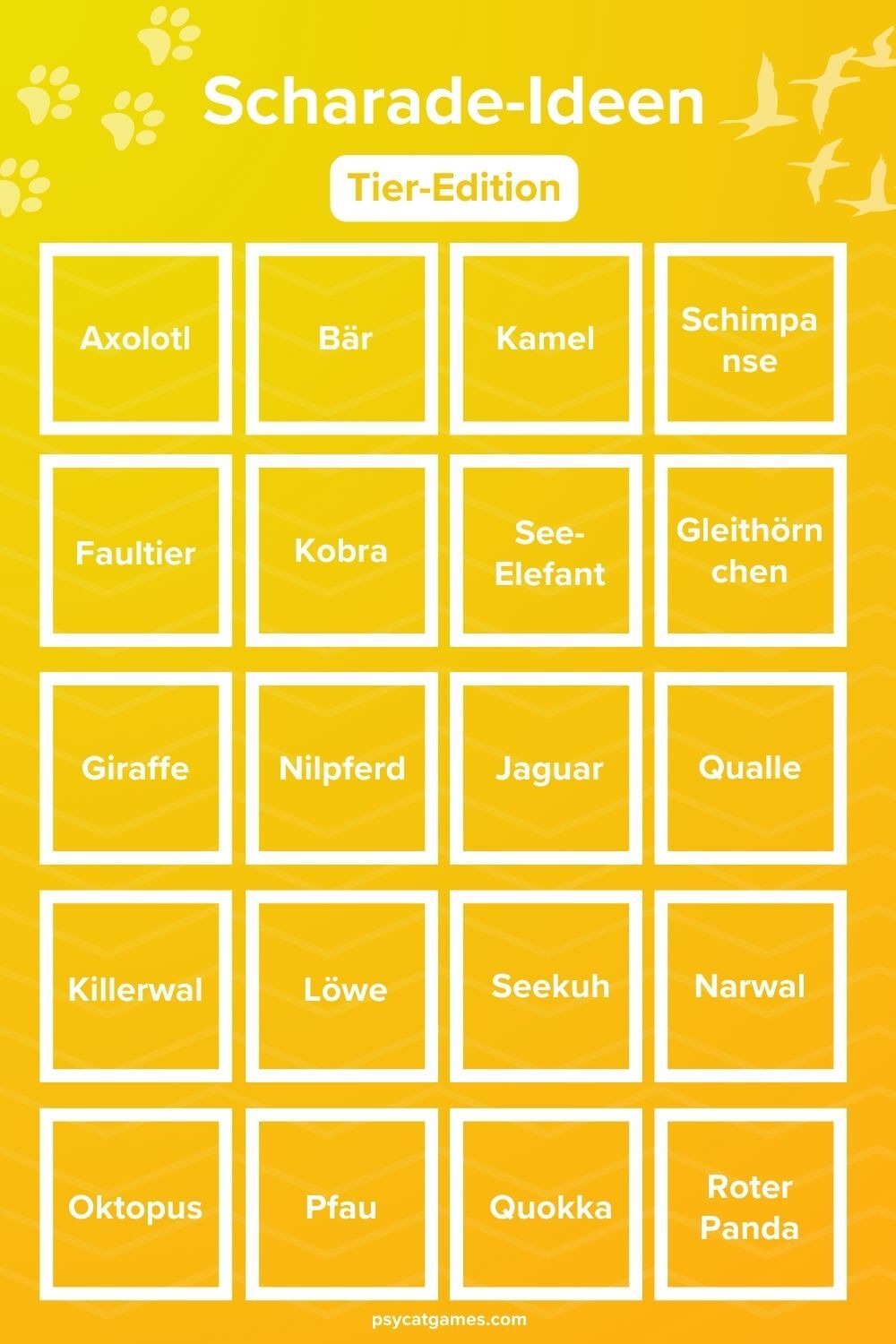 Schwierige Tier-“Scharade”-Ideen für Erwachsene