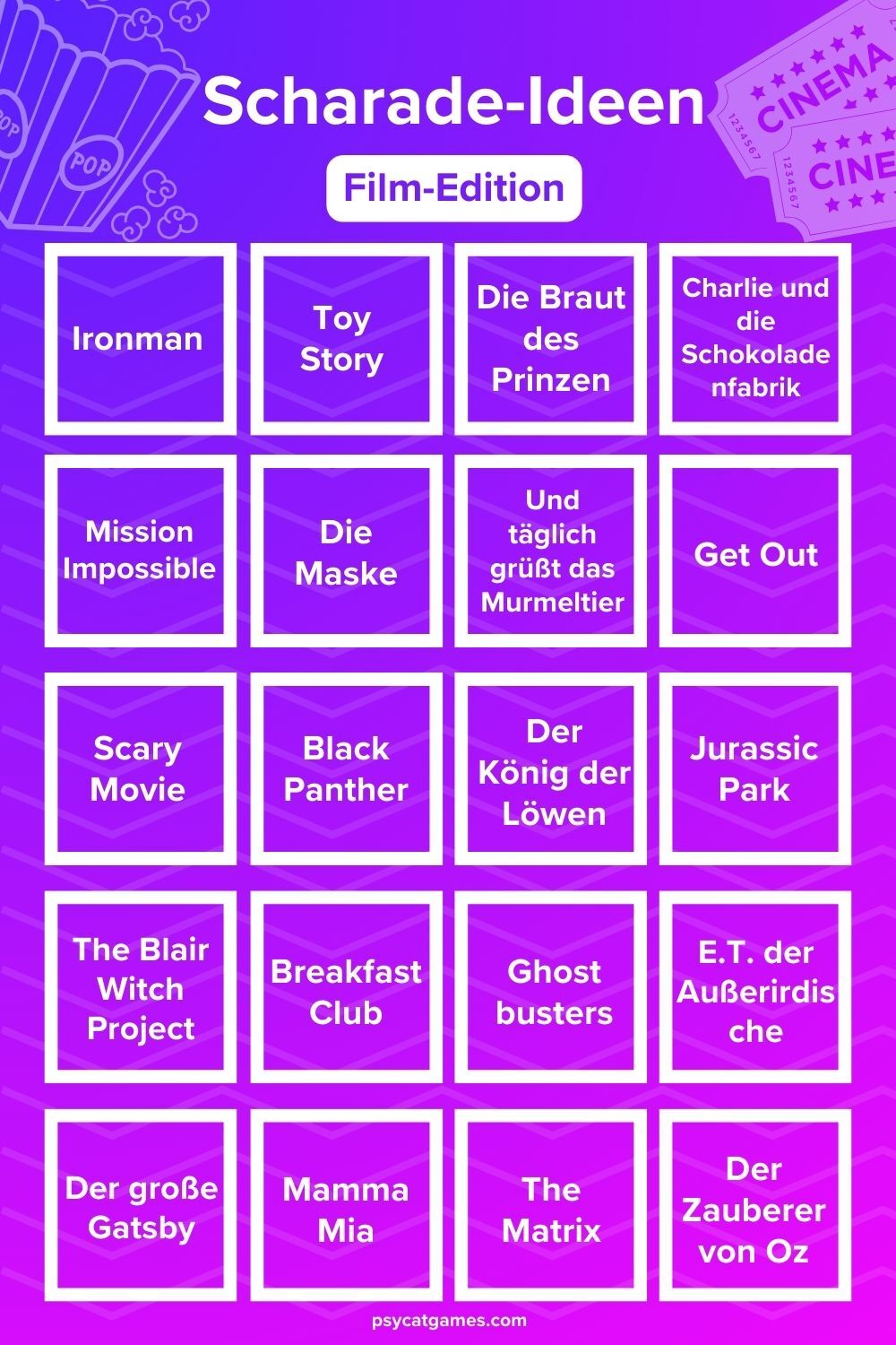Ein Spieleabend ohne Filme? Unvorstellbar! Ob du nun ein Fan von alten Klassikern oder den neuesten Hits bist, ein Spiel “Scharade” mit diesen Filmtiteln wird garantiert für Begeisterung sorgen. Also, macht es euch gemütlich, schnappt euch eine Tüte Popcorn und lasst die Vorstellung beginnen!