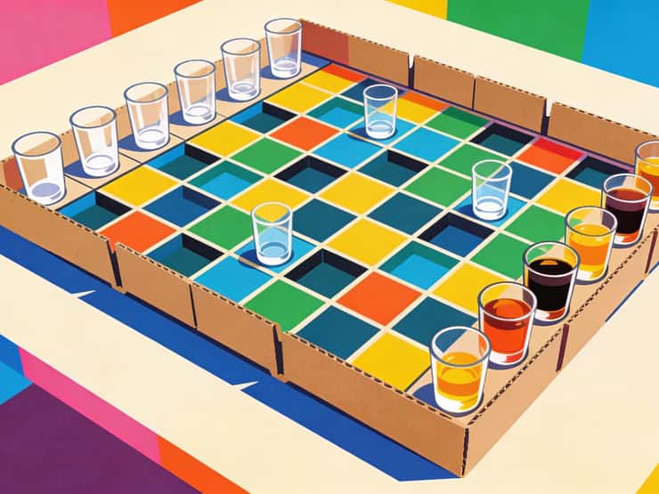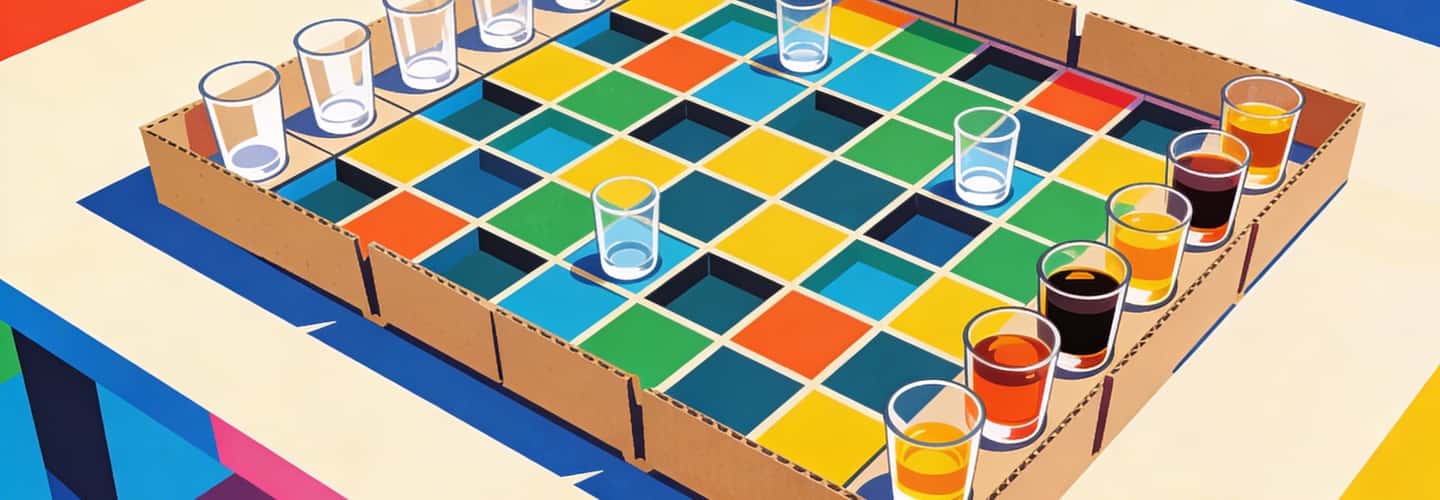 Anything flat will do: cardboard, corkboard, or even an old pizza box. Just make sure it can hold 5–10 shot glasses without collapsing mid-battle. 👉 Not into sinking ships? Try Drinkopoly, where the board is the party.