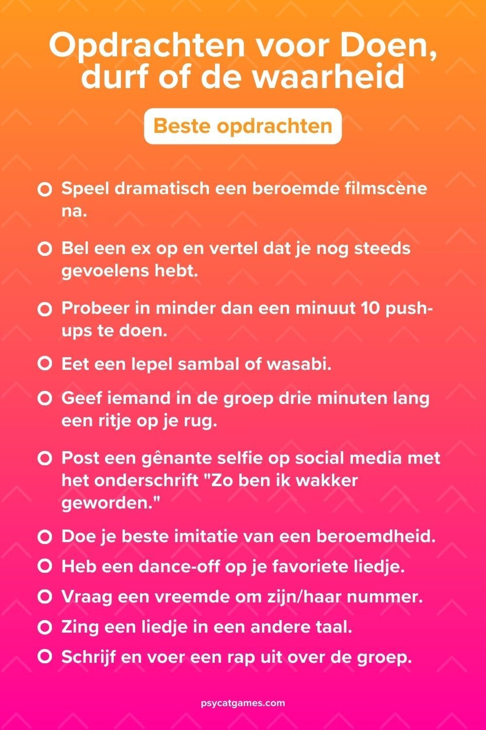 - 🥳 Beste inspiratie voor “Doen, durf, of de waarheid” opdrachten