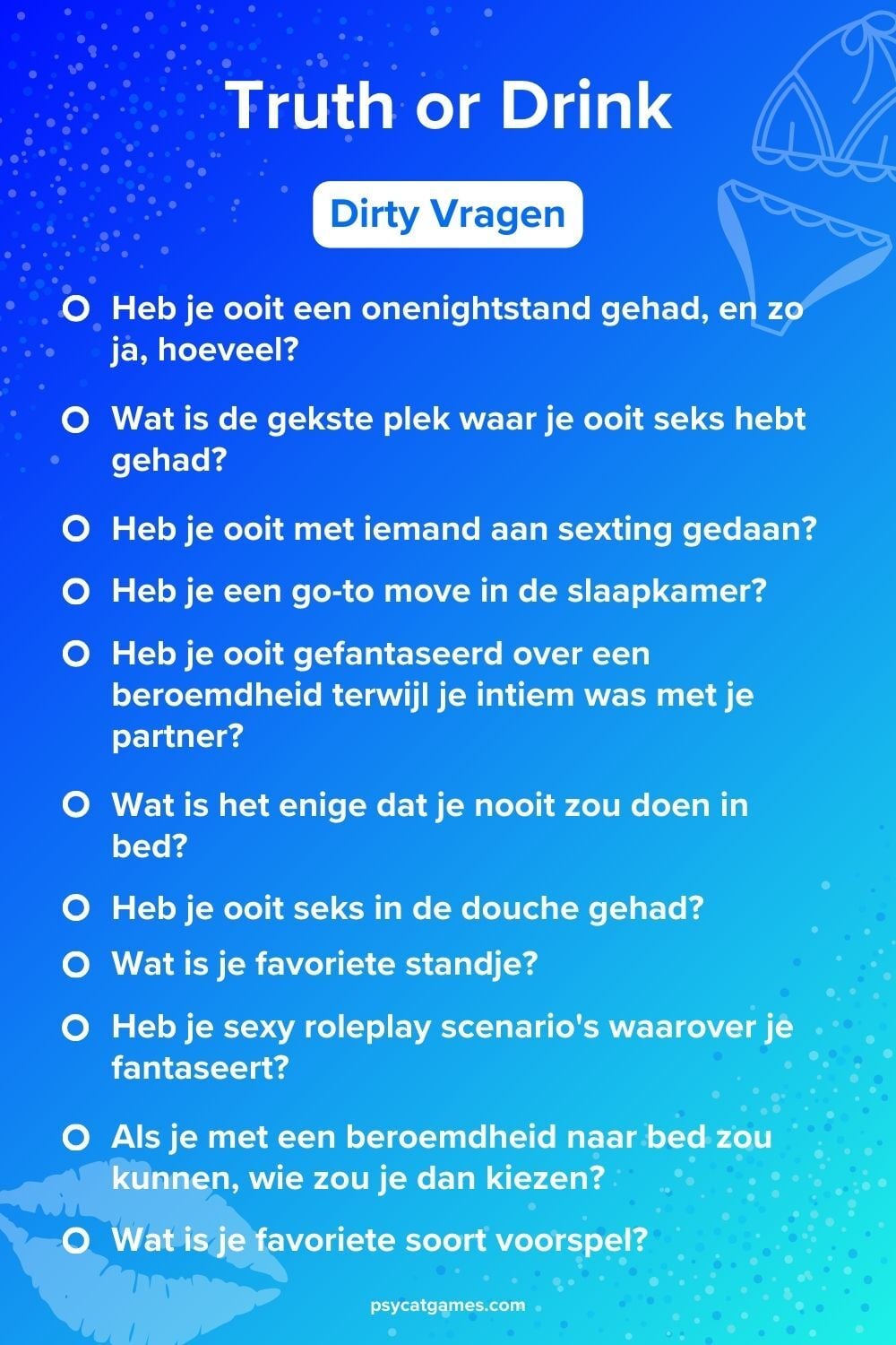 Klaar om je potje “Truth or Drink” naar een hoger niveau te tillen? Hier zijn wat dirty “Truth or Drink” vragen om je feestje net dat beetje extra te geven:
