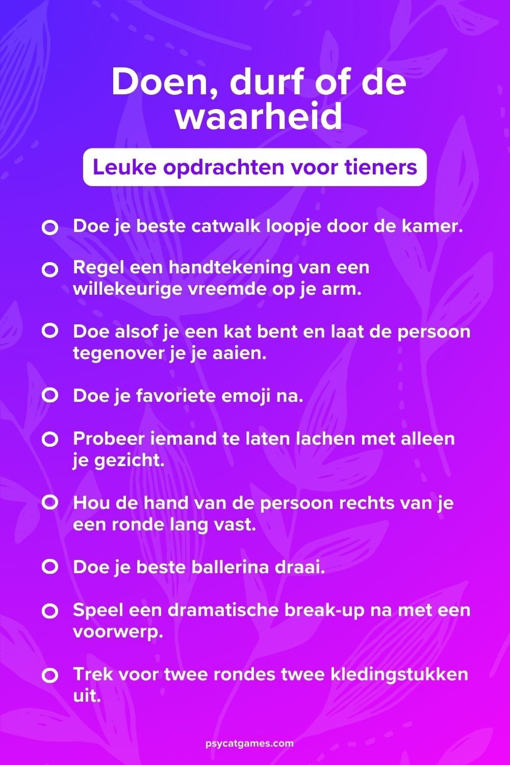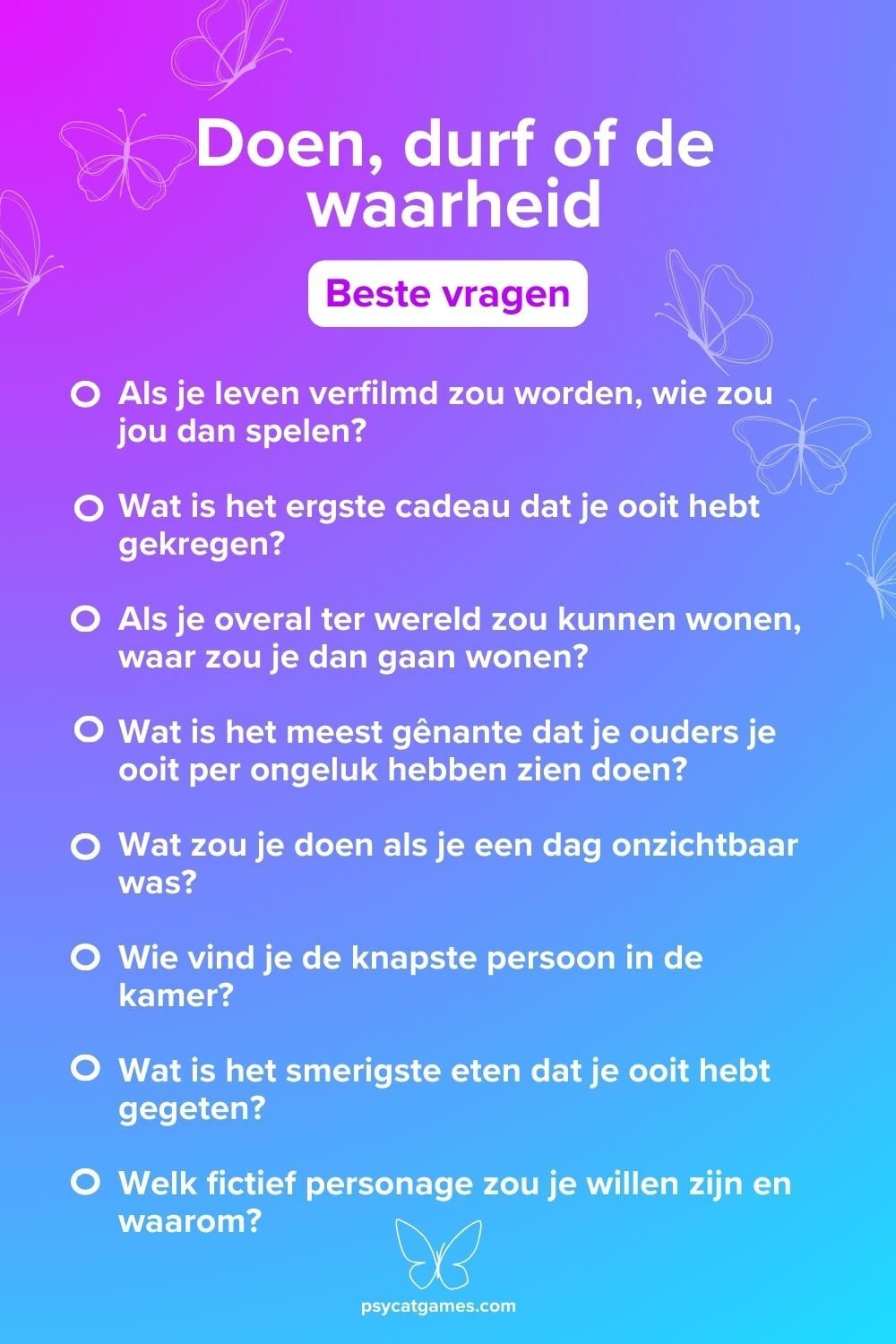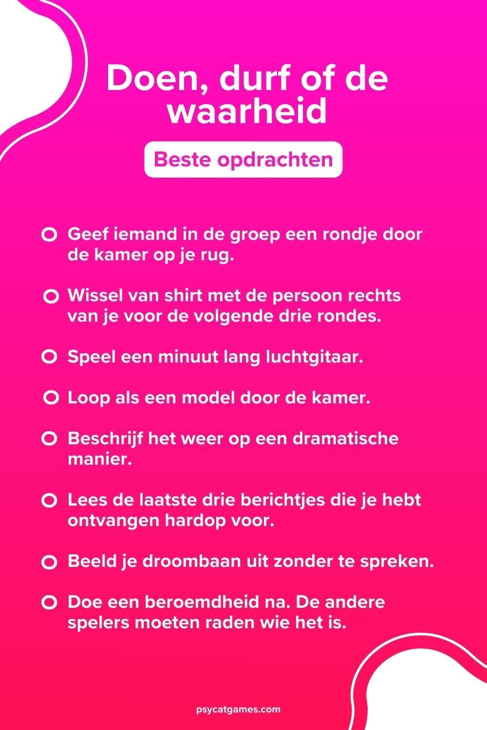 👉 Op zoek naar meer ideeën over hoe je “Doen, durf, of de waarheid” kunt spelen? Check ons “Doen, durf, of de waarheid” regels artikel voor de volledige spelregels en meer varianten.