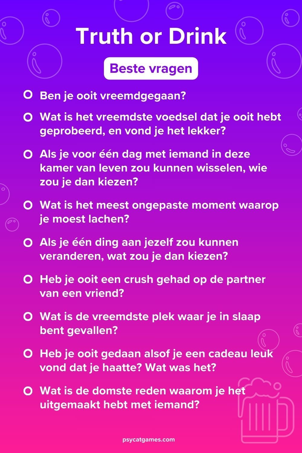 Op zoek naar meer “Truth or Drink” vragen voor je volgende potje? Geen zorgen, we hebben alles wat je nodig hebt! De online versie van dit spel heeft allerlei vragen voor je, van hilarisch tot awkward!
